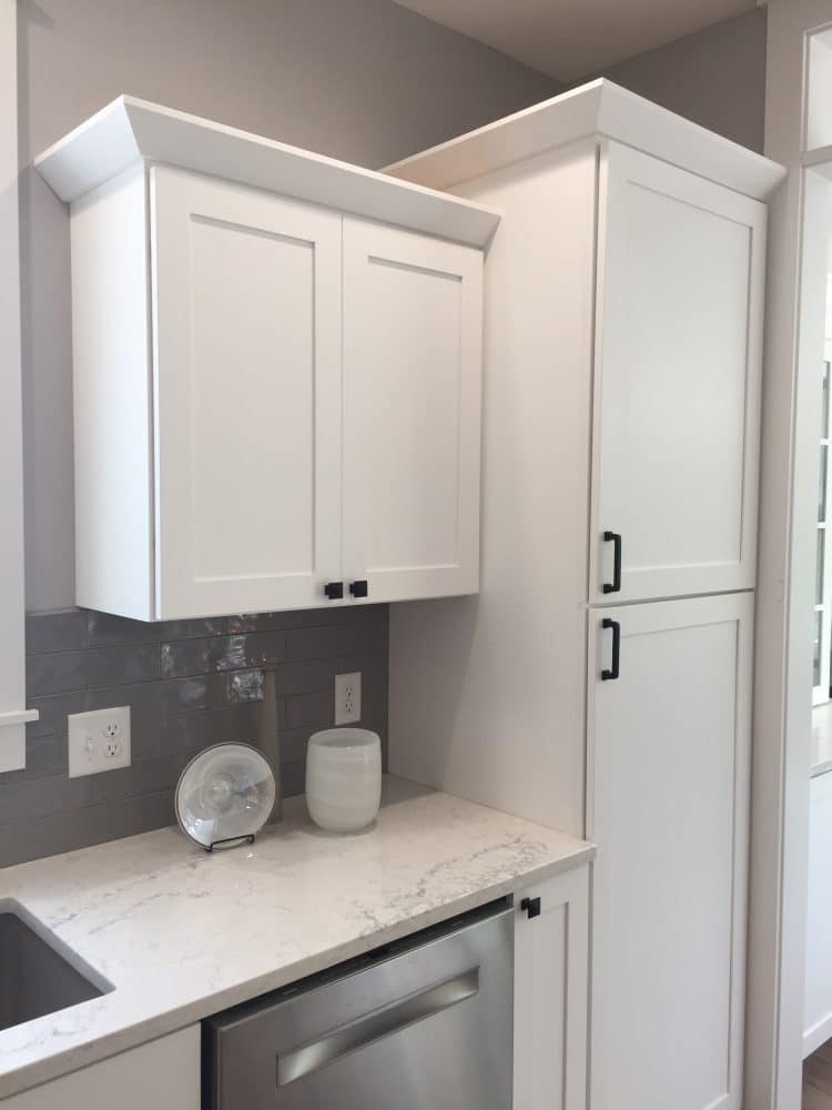 White painted Shaker style kitchen with adjacent dining room. Cabinets are from Woodland Cabinetry in a white opaque finish.